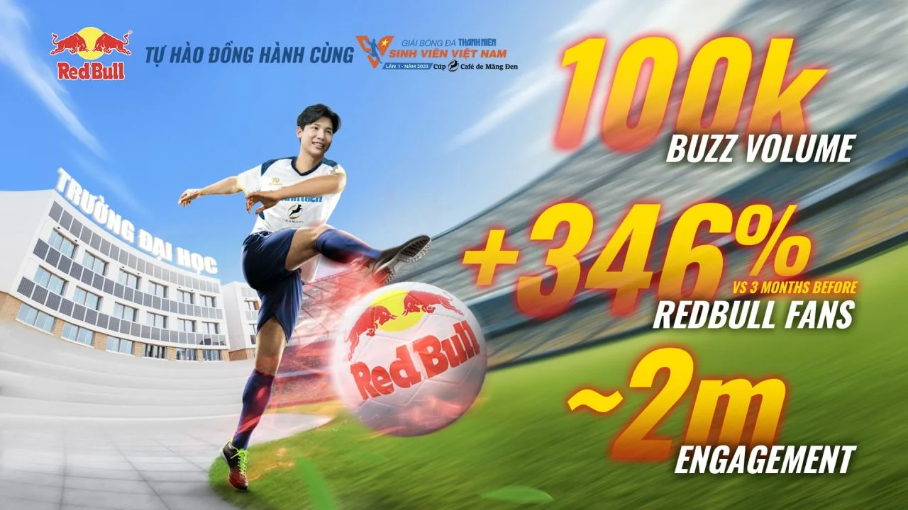 Tổng lượng thảo luận (Buzz Volume): hơn 100K Buzz thảo luận về Giải Bóng Đá Thanh Niên Sinh Viên với sự đồng tài trợ của Red Bull.- Số lượng fans Red Bull tăng lên 346% so với 3 tháng trước khi bắt đầu giải đấu.
